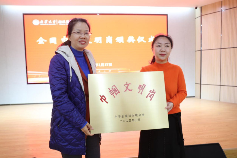 黄芳为南华大学病理生理学教研室颁发“全国巾帼文明岗”奖牌