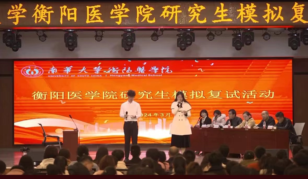 3月10日下午,南华大学衡阳医学院考研考研模拟复试和咨询活动在北校食堂3楼学生活动中心成功举行。本次活动由衡阳医学院主办,衡阳医学院党委书记曾国、常务副院长屈顺林、党委副书记卢清华、副院长曾希出席,南华大学附属第一医院妇产科罗桂芳主任医师、外科廖俊琳副主任医师、儿科学杜九中副主任医师,南华大学附属第二医院内科田国平教授、麻醉学曾志英副主任医师,南华大学附属南华医院影像学沈严严主任医师等作为面试专家参加,学院研究生招生办、附属医院招生办负责人以及19级年级办全体辅导员、院就业专干等出席本次活动,学院模拟考研复试面试学生代表共八人以及学生代表共400人余人参加线下活动,本次活动同步开展了网络直播,约7000余人线上参与。