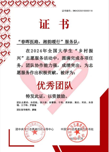 为深入学习宣传贯彻习近平新时代中国特色社会主义思想和党的二十大精神,服务全面推进乡村振兴,动员引导青年学生投身乡村振兴一线,中国农业发展银行、团中央青年志愿者行动指导中心联合200个县开展2024年全国大学生“乡村振兴”志愿服务项目,最终共有748所高校的1000支大学生志愿服务团队入选。活动结束后,经层层选拔,共有100支团队获评“优秀团队”,基础医学院“春晖医路,湘韵暖行”实践团成功入选优秀团队。