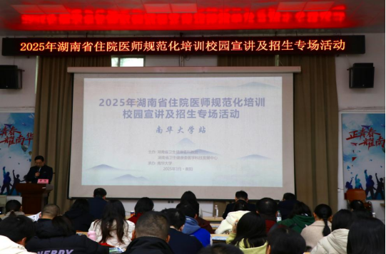 3月29日下午,由湖南省卫生健康委科教处及湖南省卫生健康委医学科技发展中心共同主办,南华大学具体承办的“湖南省住院医师规范化培训进校园宣讲及招生”专题宣传活动--南华大学站顺利举行。全省共29家培训基地参与,1500余名南华大学衡阳医学院临床医学生以线上线下形式参加。出席本次活动的有省卫生健康委医学科技发展中心肖薇薇副主任、南华大学衡阳医学院党委书记曾国、南华大学招生就业处处长徐守龙、南华大学衡阳医学院党委副书记卢清华,培训活动由委医学科技发展中心教育部贺晓华主任主持。