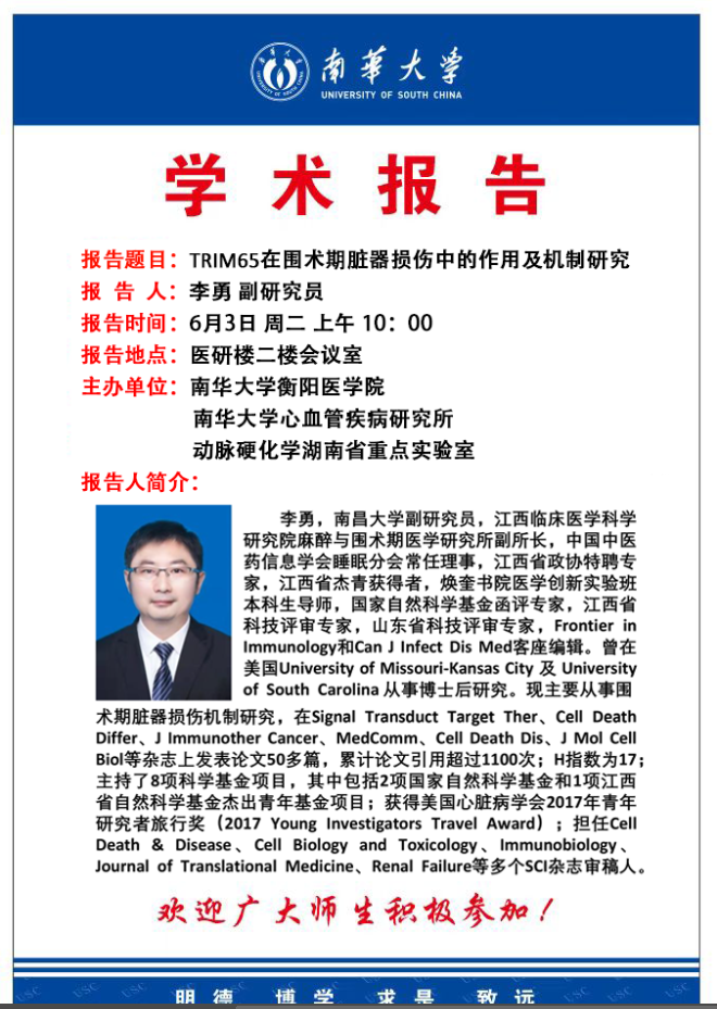 学术报告 | 符民桂教授:脓毒性休克的分子调控机制 & 李勇副研究员:TRIM65在围术期脏器损伤中的作用及机制研究