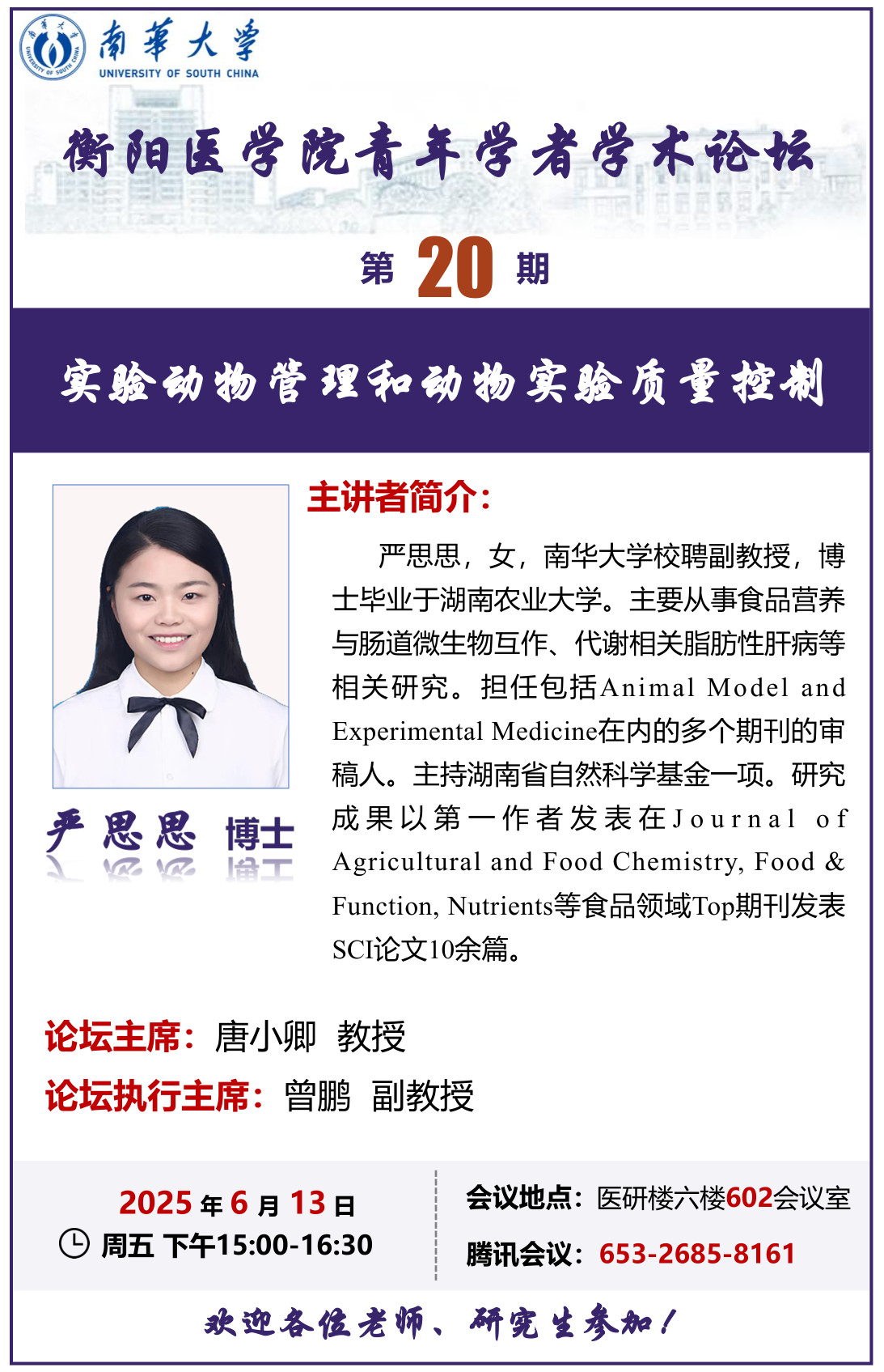 衡阳医学院青年学者学术论坛 | 严思思副教授:实验动物管理和动物实验质量控制