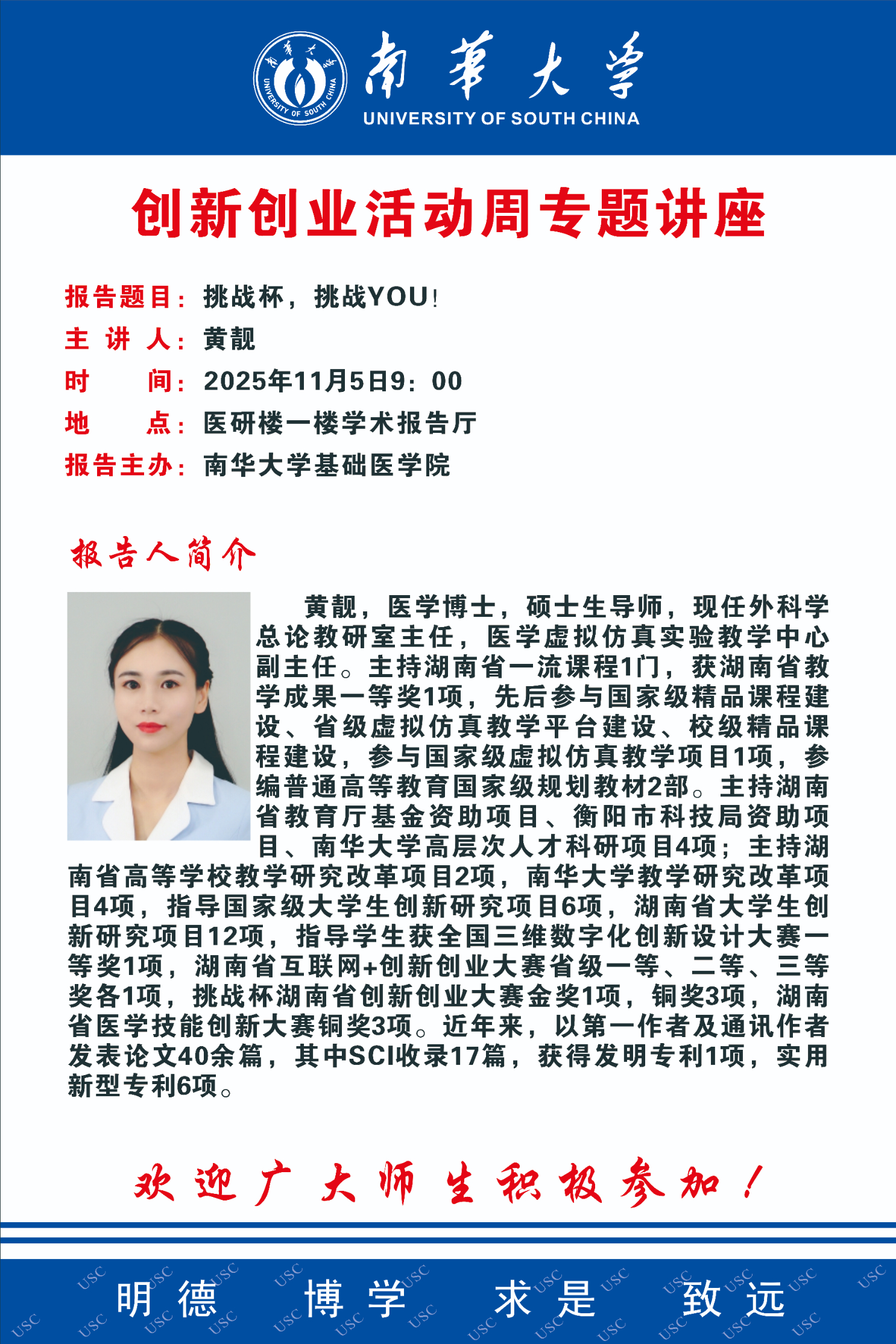 创新创业活动周专题讲座 | 黄靓:挑战杯,挑战YOU!