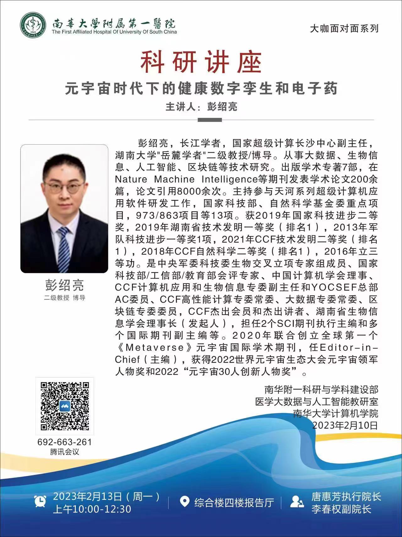 科研讲座 | 附属第一医院大咖面对面系列:元宇宙时代下的健康数字孪生和电子药