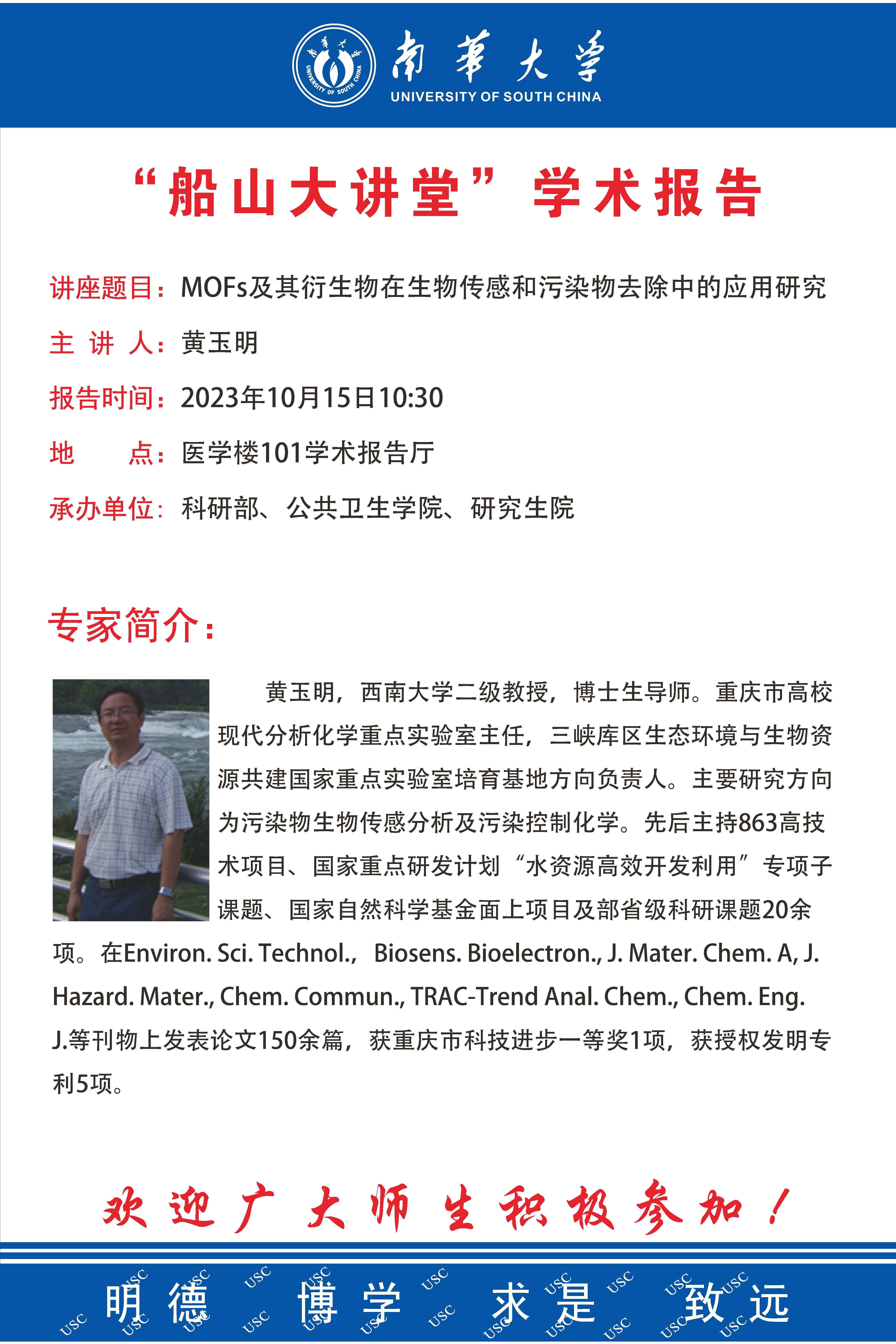 学术讲座 | 黄玉明教授:MOFs及其衍生物在生物传感和污染物去除中的应用研究