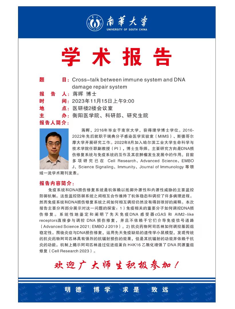 学术讲座 | 蒋晖博士:Cross-talk between immune system and DNA damage repair system