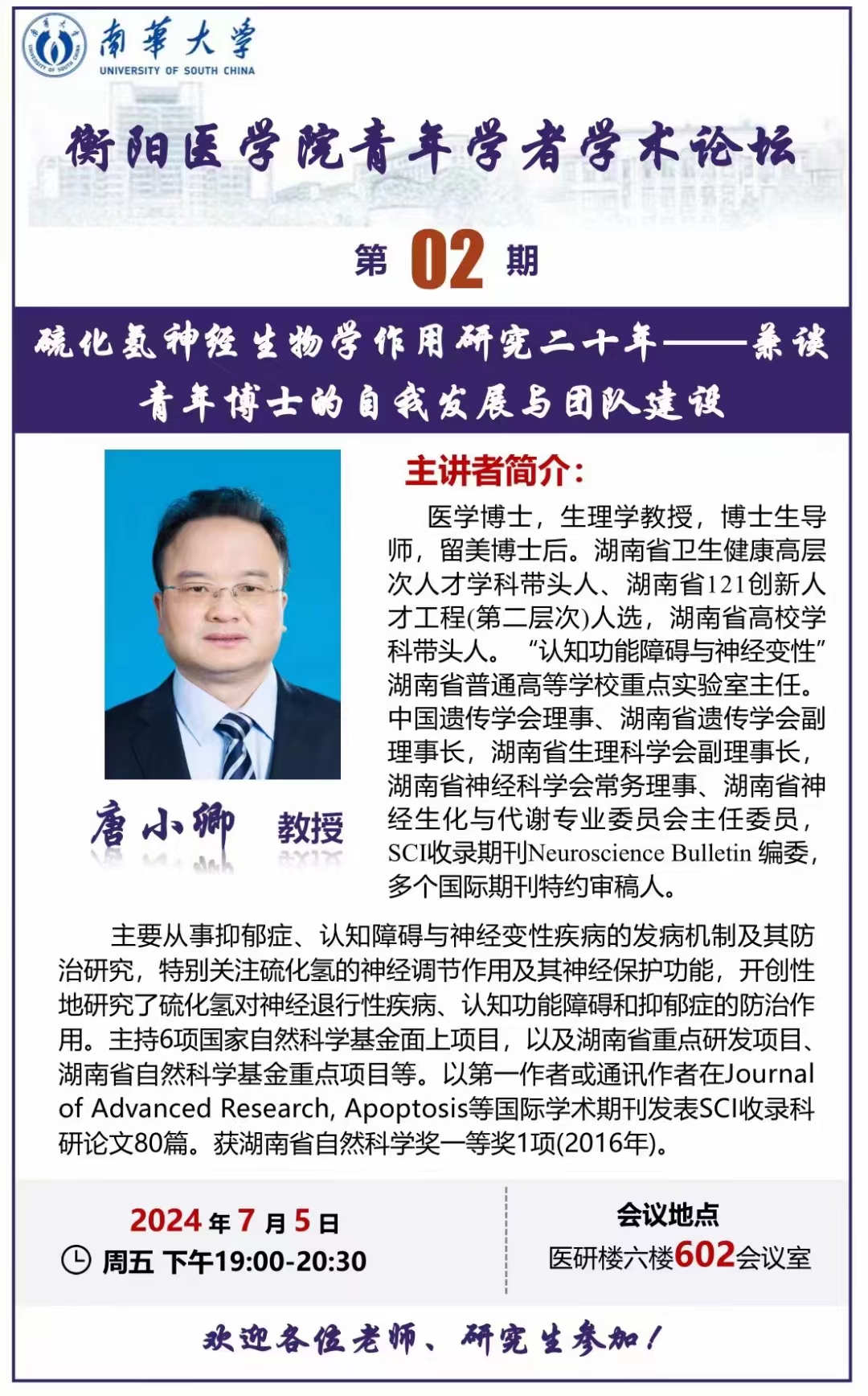 衡阳医学院青年学者学术论坛 | 唐小卿教授:硫化氢神经生物学作用研究二十年 -- 兼谈青年博士的自我发展与团队建设