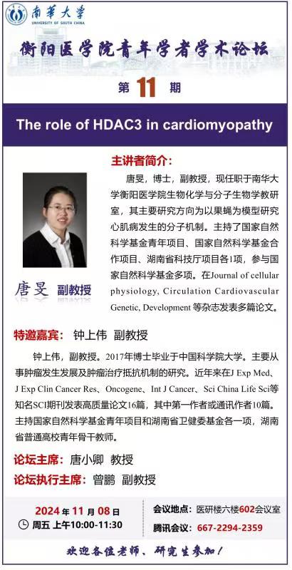 衡阳医学院青年学者学术论坛 | 唐旻副教授:The role of HDAC3 in cardiomyopathy