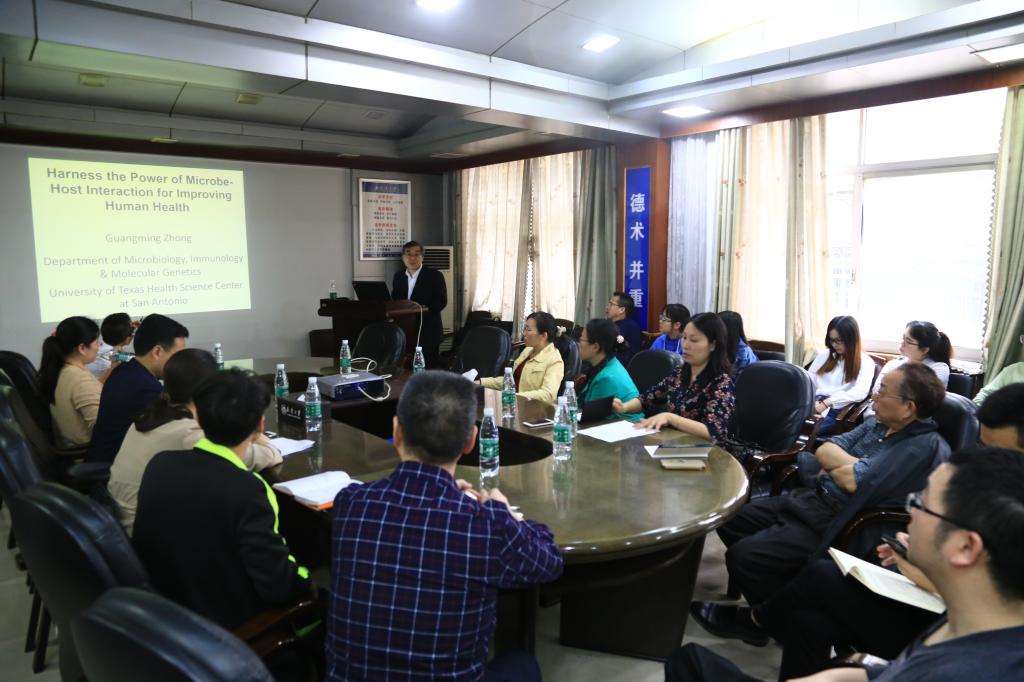 4月21日上午,美国UTHSACSA钟光明教授应邀来我校进行学术交流活动。在校期间,钟光明教授在衡阳医学院会议室做了题为“Learning chlamydial pathogenesis from the gut”的专题讲座。讲座由李忠玉副院长主持,校本部师生50余人聆听了讲座。钟教授讲解了通过小鼠活体成像技术结合肠道微生物菌群全基因组学分析和肠道菌大数据研究,首次发现衣原体通过消化道定植后向生殖道感染的新传播途径,衣原体与胃肠道菌群的相关性;结合研究的最新成果提出生殖道衣原体感染预防的新见解,为今后衣原体应用于代谢综合征等低度炎症相关疾病的预防和治疗的研究提供了全新思路。与此同时,钟光明教授与我校病原生物学与免疫学研究所的教师们就感兴趣的科研话题进行深入交流,在学科建设、科学研究以及论文的发表等方面给予指导和帮助。讲座和学术交流活动受到了与会师生们的热烈欢迎和高度评价。