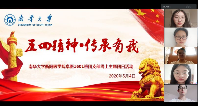 唱国歌、上团课,线上主题团会正式开始。本次活动,各团支部别出心裁,依据不同主题设计了独特、新颖的“云端交流”环节。“走近抗疫英雄”2017级影像班邀请到南华附一医院奋战在“新冠肺炎”疫情一线的窦橙云老师,为同学们分享战疫小故事,普及战疫小技巧。“青年说,进步说”各同学进行线上演讲、分享抗疫感悟、共探学习方法。“云旅游”中,同学们则用镜头“安利”了各自家乡盛景,让与会者体验了一次云端旅游。活动最后还设置了结合“五四”与抗击“新冠肺炎”疫情的有奖竞答环节,让同学们在趣味活动中涨知识。