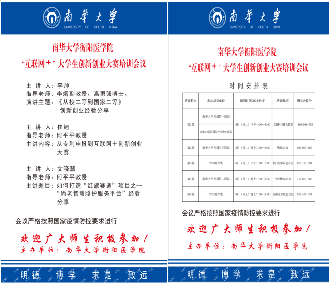 为全面落实“互联网+”大学生创新创业大赛工作,促进创新驱动创业、创业引领就业。以“互联网+”大赛为抓手,发挥科研平台的育人功能,推进科教融合,经学院研究决定,举办南华大学衡阳医学院“互联网+”大学生创新创业大赛培训会议。现将有关事项通知如下: