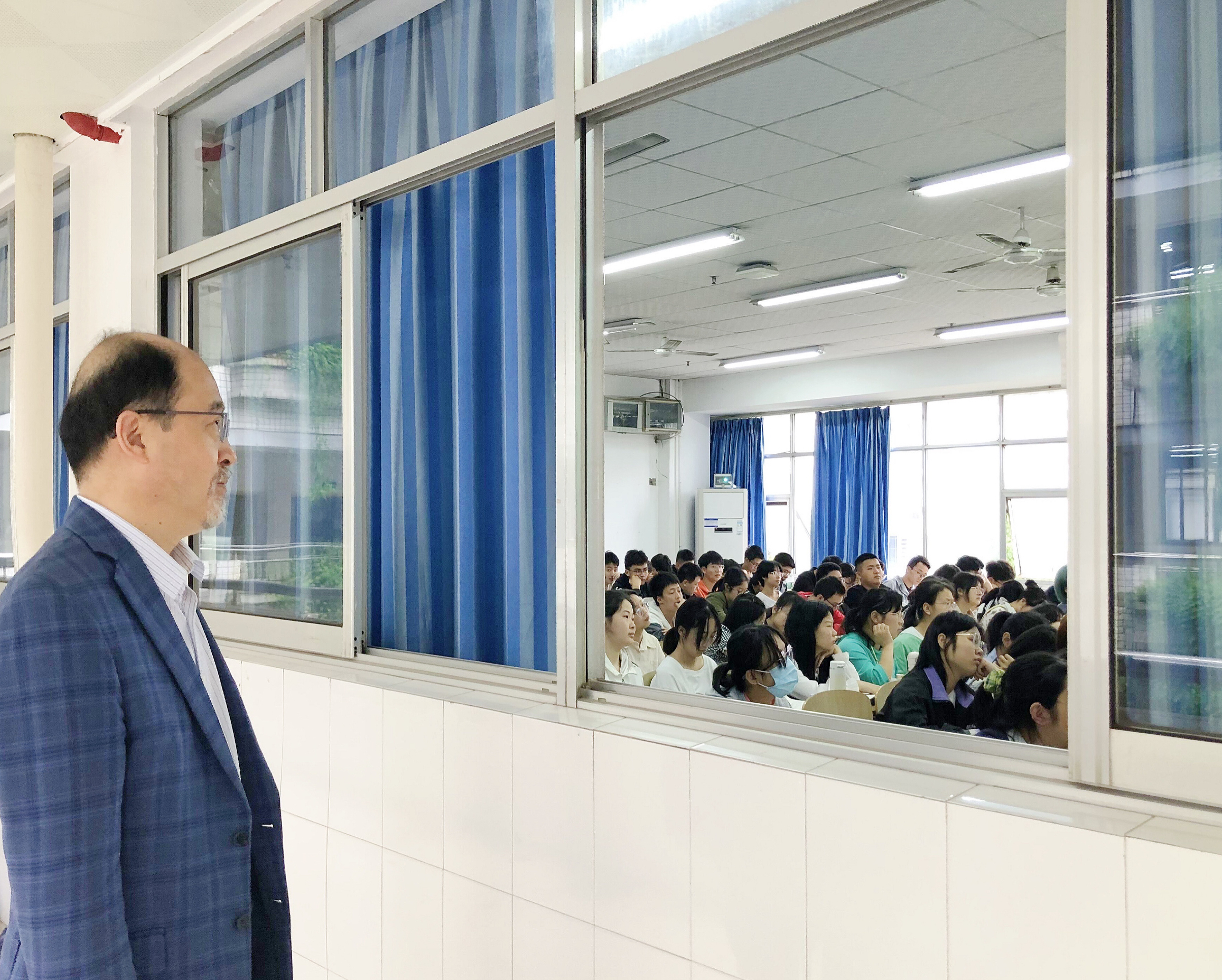 为深入贯彻落实学校第四次党代会会议精神,进一步提高本科教育教学的人才培养质量,统筹教学管理、学科专业建设、立德树人教育三方面工作,南华大学校领导们深入教学一线听课评课,督查督导教学情况,指导新学期教学运行工作。2022年5月10日,南华大学副校长王福俤教授深入课堂听课观摩,依次检查了《细胞生物学》《有机化学》《中国近代史纲要》《诊断学》《病理生理学》《大学英语》和《医学微生物学》这7门课程的课堂教学效果。南华大学基础医学院分管教学工作的周洲副院长陪同王福俤校长前行检查。