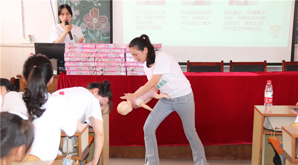 活动伊始,由康复科护士长曾亚华通过干货满满,简要易懂的PPT,生动形象地向同学们讲解了海姆立克急救法的原理、方法、实施步骤及异物卡喉的预防措施。随后在操作技能学习环节,6名护理志愿服务队的成员采取舞蹈演绎的形式向大家现场演示了海姆立克急救方法。在最后的辅导讲解过程中,所有志愿者们手把手地向孩子们传授“石头剪刀布”的奇妙口诀和操作要点,重点讲解了急救步骤、部位、冲击方向等细节知识。同学们在轻松愉快的氛围中认真学习、相互练习,并在校长的鼓舞下表示愿意将自己今天所学得的急救知识向周遭人普及。