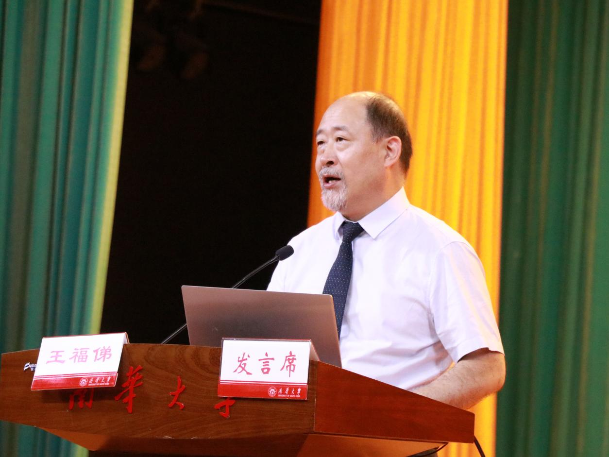 最后,南华大学党委委员、副校长、衡阳医学院院长王福俤作重要讲话,他首先对2022级新同学的到来表示最热烈的欢迎,他带领大家回顾了衡阳医学院厚重、优秀的过往发展历程,介绍了衡阳医学院在人才培养方面取得的巨大成就,他从四个方面对2022级全体本科新生提出期待和要求:一是积极传承衡阳医学院蕴藏的精神和文化、永担使命和责任。二是希望同学们成为好学求知的医学生;三是希望同学们成为追求卓越的医学生;四是希望同学们成为敬佑生命的医学生。全体本科新生要按照习近平总书记强调的:“广大医务工作者要恪守医德医风医道,修医德、行仁术,怀救苦之心,做苍生大医,努力为人民群众提供更加优质高效的健康服务。”去践行、去努力。