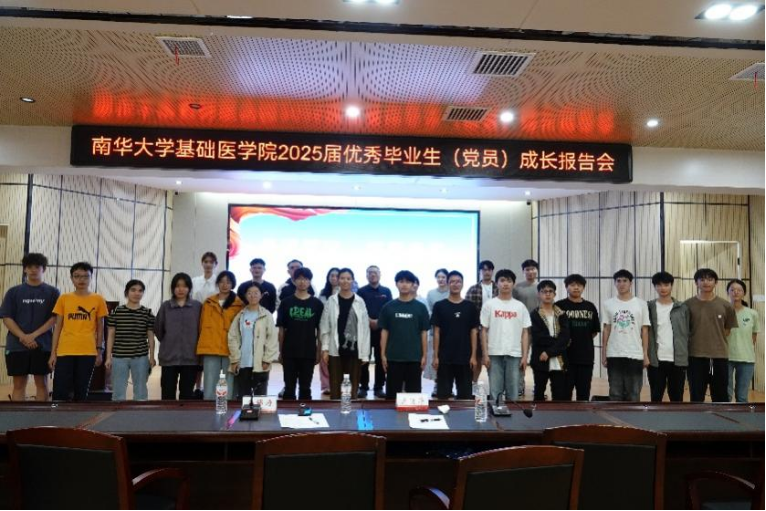 为宣传优秀毕业生(党员)先进事迹,帮助低年级同学借鉴他们的成功经验,合理规划大学生涯,最终成为一名德智体美劳全面发展的新时代优秀青年,5月28日晚,南华大学基础医学院2025届优秀毕业生(党员)成长报告会在医研楼学术报告厅顺利举办。基础医学院党委副书记卢清华、团委书记金锦涛出席,易奇龙、刘凌云、唐慕尧、银金玉、谭文慧五位优秀毕业生党员代表分享成长故事,23、24级学生代表现场聆听。
