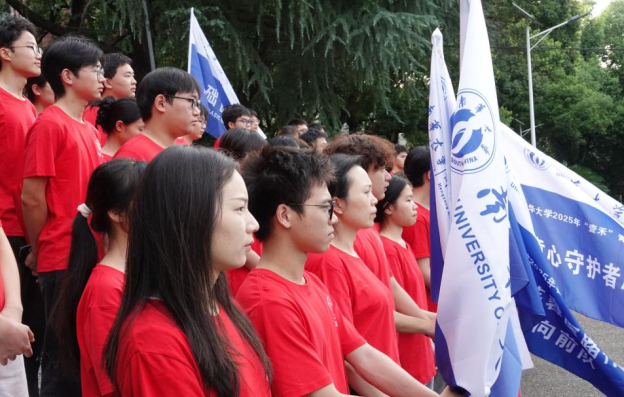 2025年7月6日,南华大学衡阳医学院2025年暑期社会实践活动出征仪式暨授旗仪式在医学楼前庄严举行。在学院党委书记曾国、党委副书记卢清华的殷切嘱托与指导老师胡奉佳的悉心指导下,“杏林纂爱,医路向阳”志愿服务队19名队员昂首挺立,开启了一段用医学温度点亮生命、以青春担当书写华章的实践征程。
