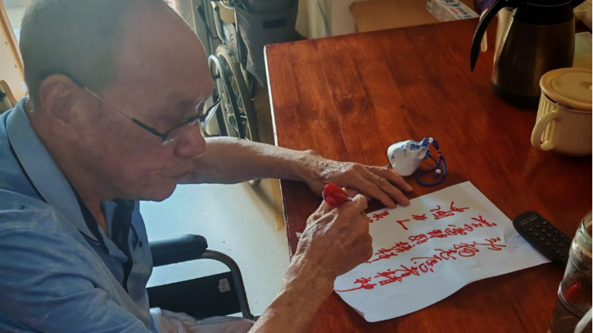 活动尾声,得知团队来自南华大学衡阳医学院后,一位老人将志愿者们带到房间,挥毫写下“弘扬志愿者精神,学习雷锋好榜样,中国好人!”二十个遒劲大字。写罢,老人动情道:“谢谢你们大热天来陪我们,教我们做实用的东西,让我们都觉得很感动!”