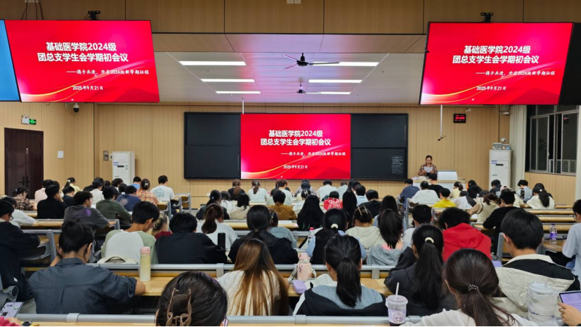 2025年9月21日晚,基础医学院2024级团总支学生分会学期初会议在南华楼112顺利召开。本次会议以“携手共进,开启2024级新学期新征程”为主题,年级全体辅导员、团学会全体成员及各班班长、团支书齐聚一堂,共商新学期发展大计。