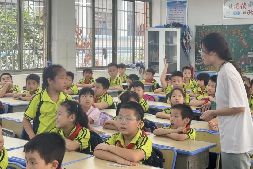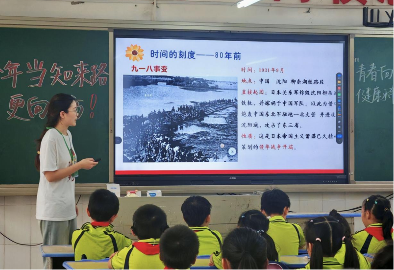 为让历史知识“活”起来,小洪老师在课程中精心设计了多维互动环节:她展示泛黄的抗战时期珍贵老照片,让孩子们触摸历史的温度;播放剪辑的抗战纪实影像片段,让英雄故事更具感染力;发起“历史知识抢答”,“抗日战争胜利是哪一年?”“‘九一八事变’发生在哪个省份?”等问题抛出后,同学们纷纷举手抢答,课堂氛围热烈而有序,原本抽象的历史知识在互动中变得鲜活易懂。