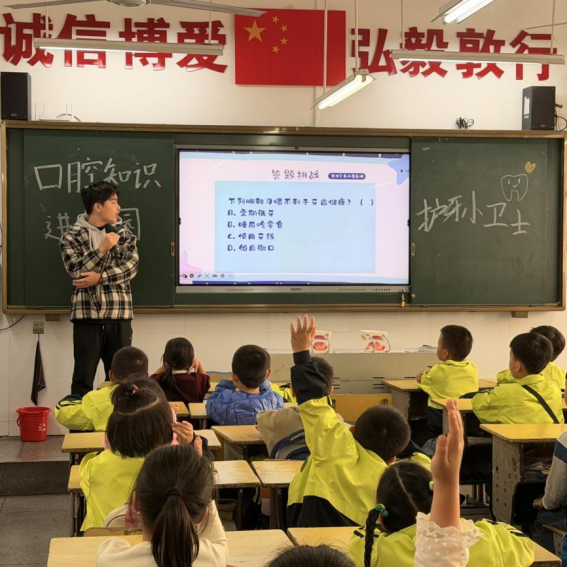 “刷牙要刷多久?”“睡前吃零食对牙齿好吗?”活动尾声的有奖快问快答环节,成为检验学习成果的精彩时刻。志愿者徐雁韬抛出的问题,孩子们应答如流,举手速度堪比“闪电”。准确地回答、自信的神情,展现出对护牙知识的扎实掌握。拿到小奖品的孩子们脸上洋溢着笑容,更坚定了“守护牙齿健康”的责任感。