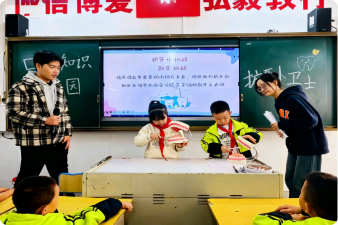 “上下两排兵,驻守大城门,哪个进城去,砸得碎纷纷!”活动伊始,杨璇辅导员的趣味谜语瞬间点燃全场。孩子们争先恐后地举手抢答,在欢声笑语中拉近了与“大学生老师”的距离。互动交流中,孩子们逐渐明白,牙齿不仅是咀嚼食物的“得力助手”,更是影响发音清晰和面容美观的“重要伙伴”,爱护牙齿的自觉意识在潜移默化中生根发芽。