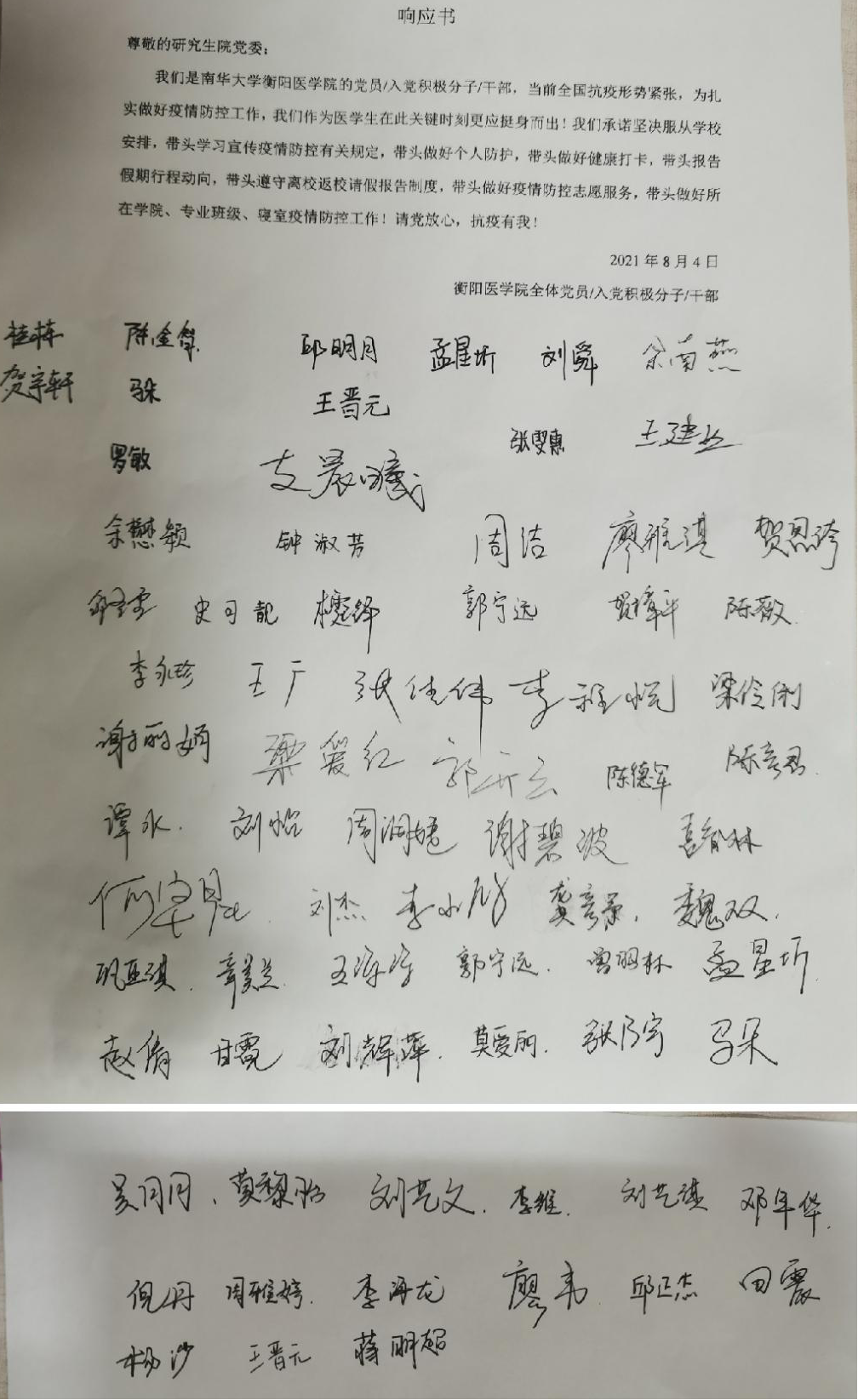 疫情就是命令,防控就是责任。8月1日,党委研究生工作部和校研究生党建研究会向南华大学全体研究生党员发出了“请党放心,战疫有我”倡议书,得到了全体研究生党员和入党积极分子积极响应,其中共有186名暑期留校研究生党员主动报名参与疫情防控志愿服务,在南华大学研究生团委、研究生会的积极引导下共同组成了南华大学暑期疫情防控研究生党员志愿服务。这支特殊的队伍中有来自衡阳医学院的研究生党员和学生群众75名。