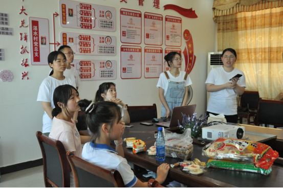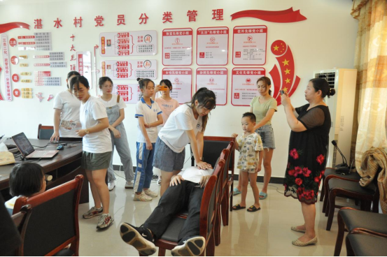 望城区乔口镇湛水村村委会汪鹏志主任在村委对实践团作了工作布置同时表达了对南华大学衡阳医学院的感谢,并重温了《雷锋日记》。在村委会会议室王楚楚、黄奕轩和唐慕尧同学针对暑假期间小孩溺水的现象进行了防专题预防的宣讲,运用在大学学习的外科学总论的知识,模拟事故发生时人工呼吸与胸外按压的实操。喻阳丽和张艺千同学通过PPT、动画视频等给大家讲解未成年人保护法、防电信网络诈骗的宣传等。
