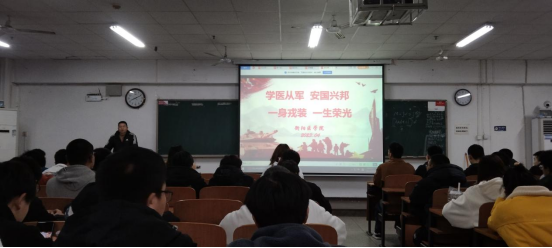 之后,郭志勇进行征兵政策宣讲。郭老师结合当前国内外局势、医学生特点进行征兵宣讲,详细介绍了大学生参军入伍的各项优惠政策,以及同学们参军入伍需特别注意的一些问题,并要求各班邀请退役复学学生代表,近期走进班级开展一次征兵主题班会,号召更多热血青年积极参军入伍,不断为国防建设输送新生力量。