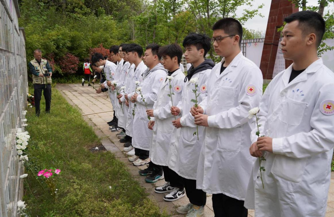 最后,学院师生身着白大褂,手握白菊,整齐站在记录着器官捐献者姓名和照片的墓碑前,怀着崇敬的心情鞠躬、献花,表达对捐献者的哀思和敬意。