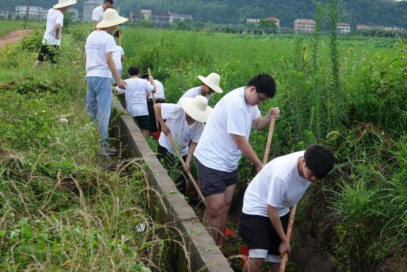 活动现场,服务团成员戴上黄色草帽,扛起锄头铲子,来到田间地头沟渠中,和当地村民一起开展清淤除草。绿秧摇曳,锄头翻飞,田埂上笑声、欢呼声、劳动号子声连绵不绝。虽然天气炎热,不少队员的队服都被汗水打湿甚至还沾了淤泥,但每个人的脸上都洋溢着满足的笑容。在队员和村民的团结协作下,经过2个小时的努力,清理任务顺利完成。蓝天白云下,大家滴落的是汗水,飞扬的是青春,收获的是整洁。“像是在田野里上了一堂生动的实践课!”一名服务团成员在参加劳动实践后发出的感慨。“离开时,看到还有不少村民顶着烈日在田里面劳作,我明白幸福生活来之不易,希望我们也能学好知识,将来更好地服务社会、报效祖国。”