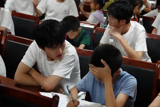 6月28日晚,服务团成员在新桥村村委会议室对当地儿童进行作业辅导。小朋友们齐齐围住服务团成员,其中一位小男孩更是兴奋地抱住一名去年来过新桥村的服务团成员:“哥哥,你又来看我啦!”