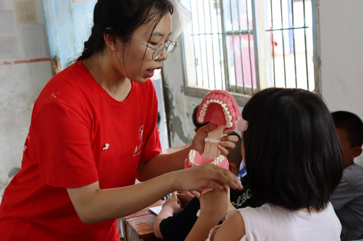 在一片欢声笑语中,医路向前队的口腔健康保健知识讲座正式开始。在讲座开始前,队员们了解到村小的孩子们正值换牙期,在孩子们口腔卫生急需得到重视的年龄,他们对口腔健康方面知识的了解却并不多。志愿者们从小谜语引入宣讲内容,普及牙齿结构与种类,围绕牙周病、口腔溃疡和龋齿的形成及预防,重点讲述了巴氏刷牙法及日常健康饮食习惯,并通过提问与孩子们上台演示检验讲解结果,孩子们不断踊跃回答问题,逐渐能够用自己的语言阐述出这些口腔疾病形成的机制和预防要点,更加明白了保护牙齿的重要性。
