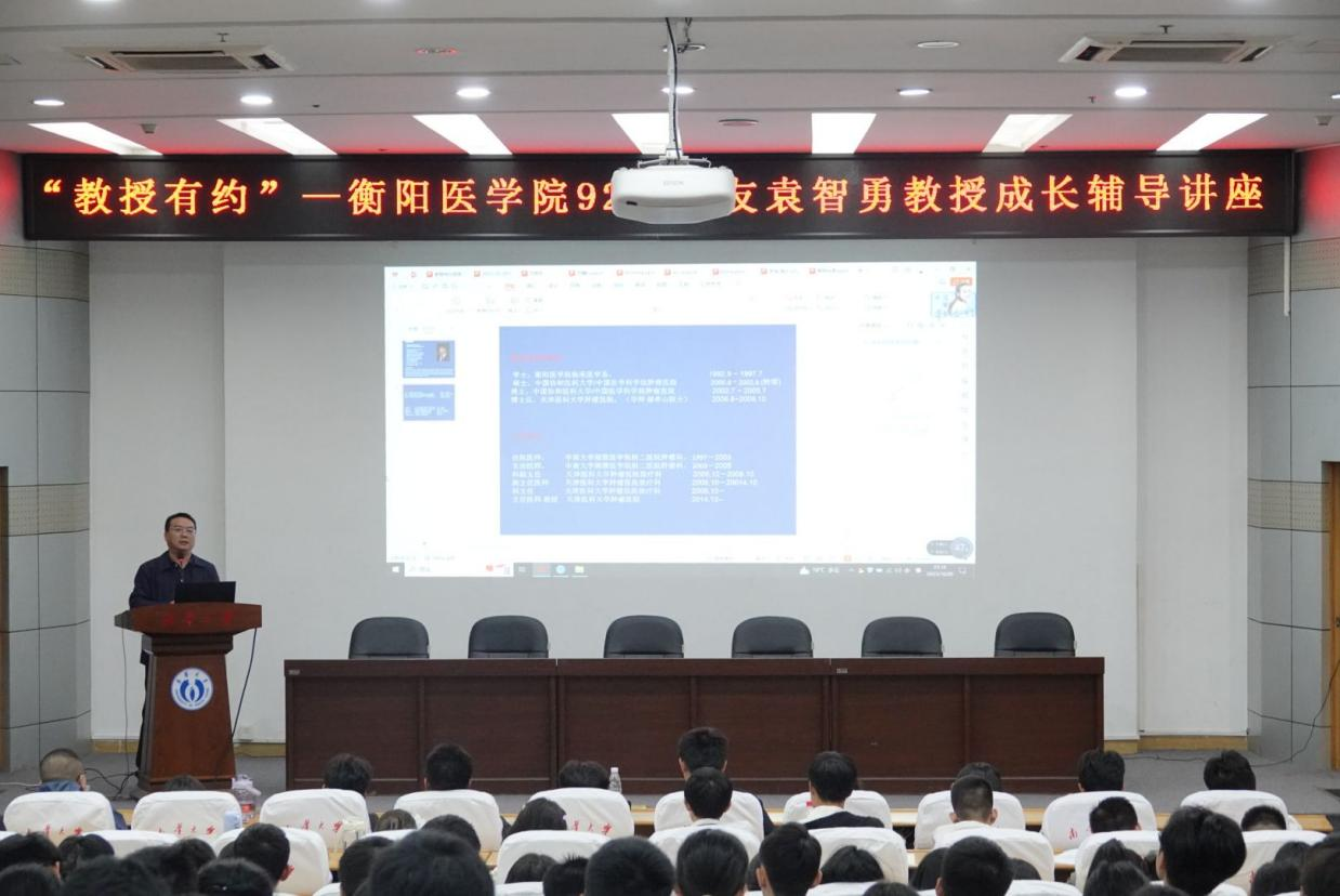 2023年10月20日晚上,由南华大学衡阳医学院主办的“教授有约”系列学生成长辅导讲座2023年秋季学期第一讲在南华大学图书馆学术报告厅举行。本次讲座邀请到了92级优秀校友、天津医科大学肿瘤医院放疗科主任袁智勇教授为衡阳医学院在校学生宣讲,衡阳医学院约400余名学生到场听讲,衡阳医学院党委副书记卢清华主持。