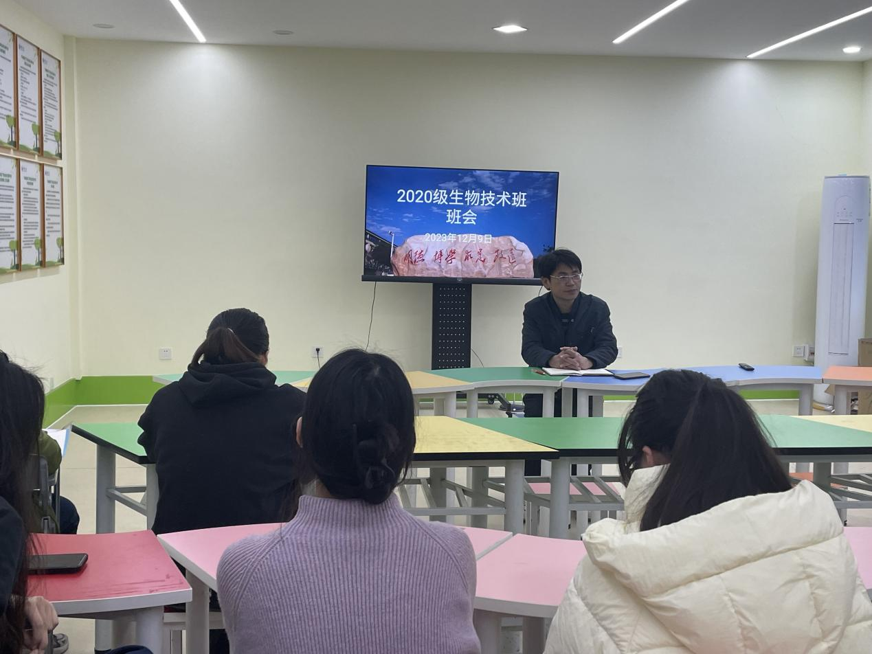 2023年12月9日晚,基础医学院20级生物技术01班在学院成长辅导室召开了一次紧凑但意义深远的班会。辅导员周玉林和班主任唐旻出席并讲话,全体生物技术班同学参加。