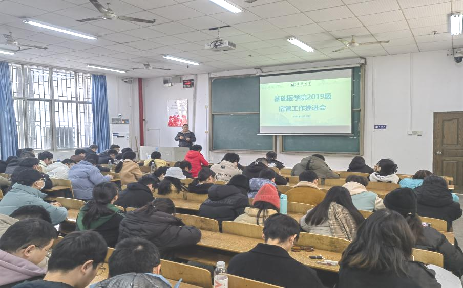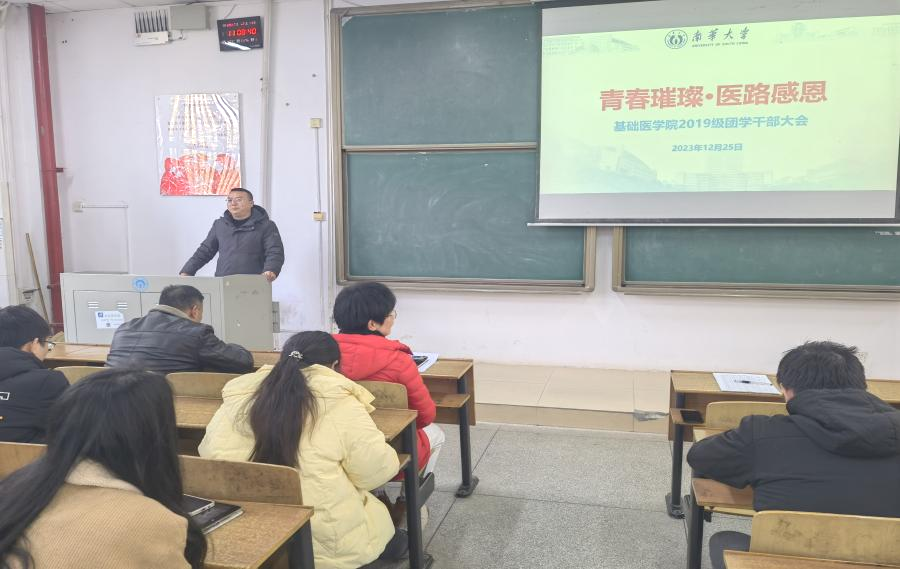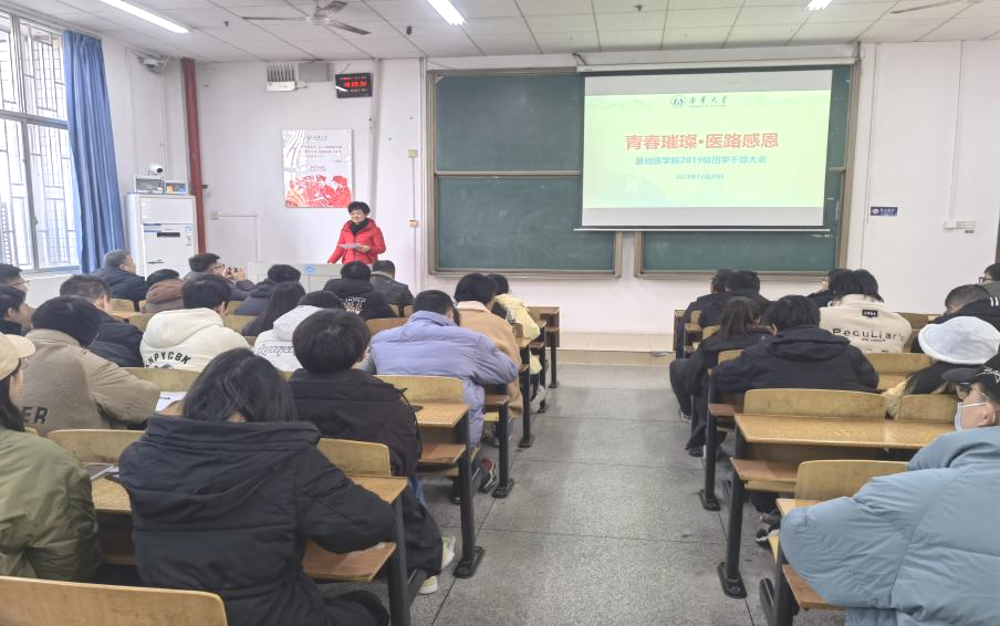 紧张而有序的2024年全国硕士研究生考试初试刚刚落下帷幕,为继续有序开展毕业生后续工作,基础医学院2019级于12月25日上午10:00在南华楼113召开全体党员丶班团骨干大会,基础医学院党委副书记卢清华、2019级辅导员彭巧滢、赵琳、麻勇3位老师,以及全年级团学会干部、各实习队干部和各班班长团支书、年级党员代表线上线下210余人。大会由彭巧滢老师主持。