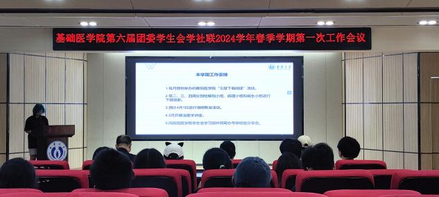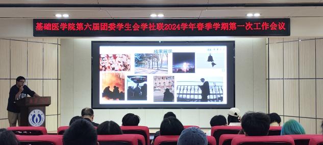 2024年4月2日中午,南华大学基础医学院第六届团委学生会学社联第一次例会在医研楼学术报告厅顺利召开。基础医学院党委副书记卢清华、学生工作办负责人李翼、团委书记廖敏出席本次会议,共72名团委学生会学社联干部参加。会议由学生会执行主席胥黎主持。