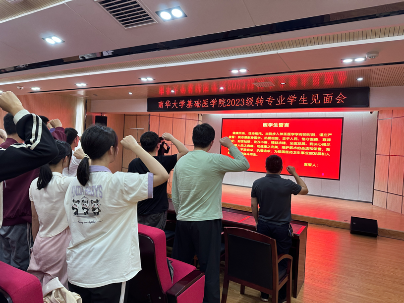 周春艳老师作了教学相关安排,就成绩认定,重修补修,学籍异动,以及如何安排重修补修的时间等问题进行了一一解答。曹霞老师、廖敏老师就档案转接、团组织关系转接、第二课堂、入党相关工作等向同学们讲解了学生工作的相关事宜。集中答疑环节,同学们踊跃提出自己的疑问,经过老师的一一解答,同学们对未来的学习更加充满信心。接着,由主持人高在翔同学领誓,全体转专业同学进行了庄严的医学生誓词宣誓,增强了同学们的使命感和责任感,在同学们心中种下“医者仁心”的种子。