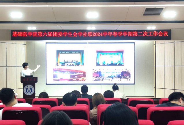 2024年6月14日中午,南华大学基础医学院第六届团委学生会学社联第二次例会在医研楼学术报告厅顺利召开。基础医学院党委副书记卢清华、团委书记廖敏出席,基础医学院团委学生会学社联全体干部参与。