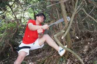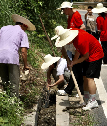 除草过后,实践团成员开始清理大路旁的排水沟。这条排水沟由于长时间未清理,已经被垃圾、淤泥和一些掉落的树枝杂叶等东西堵塞,严重影响了雨季的排水效果,甚至可能引发安全隐患。实践团成员挥起铁锹、锄头紧锣密鼓地开始清理。实践团成员刘享卓一马当先,他爬上路边的山坡,与村民们以及队员们紧密配合,成功清理了伸出路边易引发危险的树杈和树藤。身着火红的志愿服,田间地头山边挥洒汗水、服务乡村的实践团成员构成了一道亮丽的风景线。