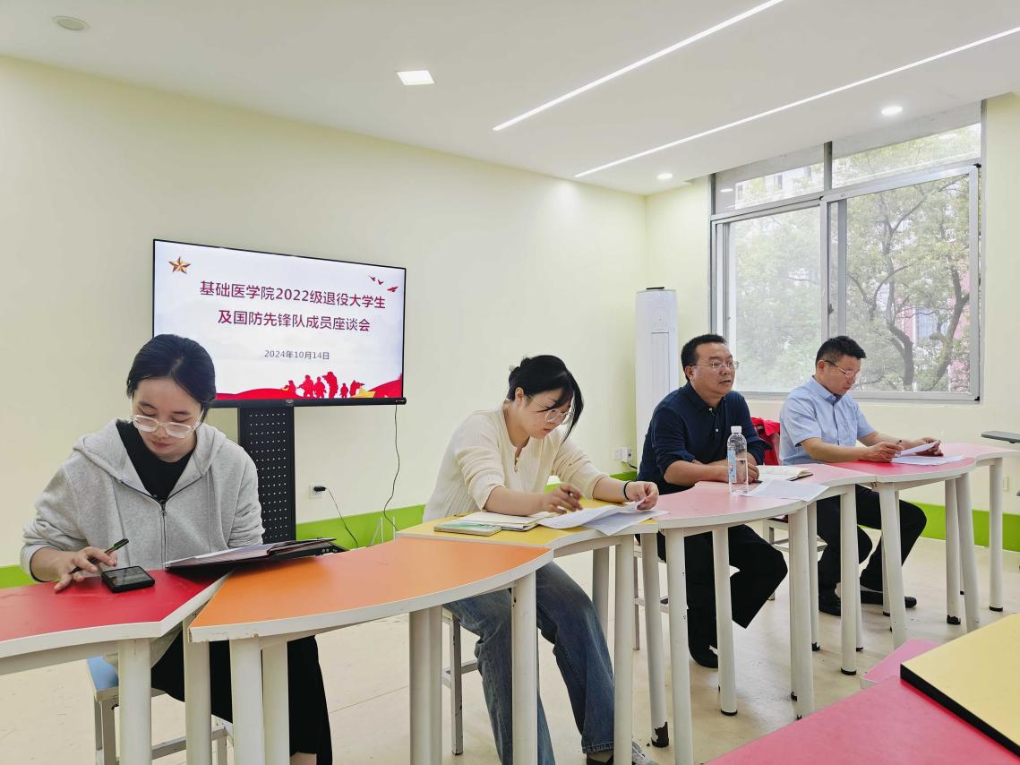 2024年10月14日,基础医学院2022级在学工办成长辅导室召开了退役大学生及国防先锋队成员座谈会。此次座谈会旨在加强退役大学生与学院之间的沟通交流,进一步了解他们的学习与生活需求,并激励他们继续发挥先锋模范作用。