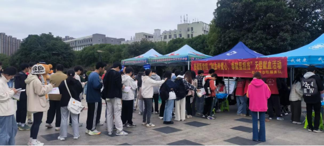 2024年11月17日,正值一年一度的国际大学生节,在南华大学红湘校区南华广场上,成功举办了一场以“献血传爱心,奉献显担当”为主题的无偿献血活动,呼吁同学们以无偿献血方式度过同学们自己的节日。本次活动由基础医学院红十字志愿服务队与衡阳市中心血站联合开展,吸引了南华大学众多学生的报名和参与,共计360人参与无偿献血知识竞答,56人参与无偿献血,献血总量达20350ml。