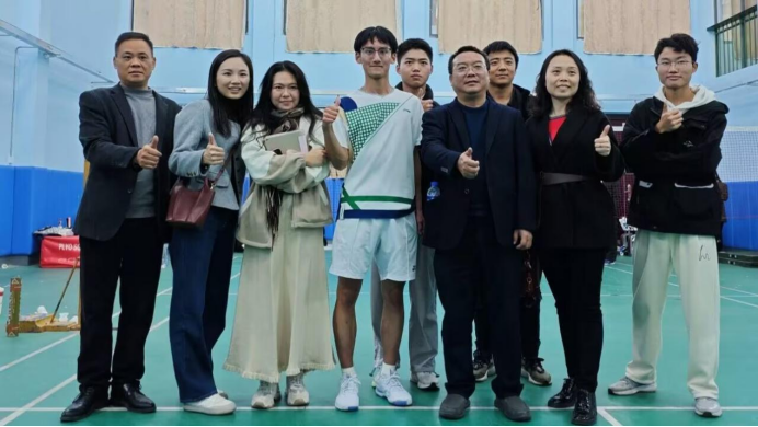 12月1日,南华大学2024年新生杯羽毛球男子单打决赛在南华大学南校体育馆举行,基础医学院2024级学生黄琪耀经过一路拼杀最终进入决赛,学院党委副书记卢清华、2024级辅导员佘雅、赵琳、胡奉佳和老师们一起到现场为黄琪耀加油助威。