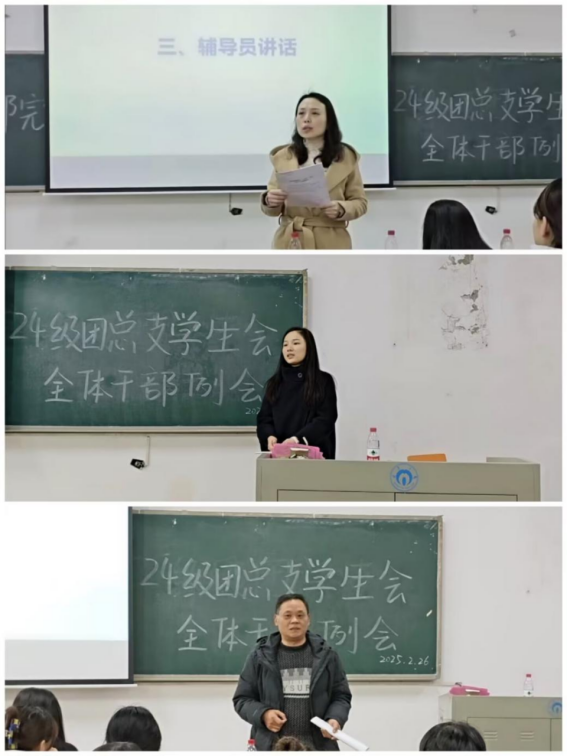会议伊始,团总支学生会发布了学院2025年春季学期的月度工作计划安排表,明确各项工作时间节点,助力成员合理安排工作,保障各项活动有条不紊开展。紧接着,各部门部长依次登台,详细介绍学期重点工作。各部门均紧密围绕学院发展与学生需求,制定了合理的计划,为新学期工作绘制清晰蓝图。随后,2024级辅导员依次登台发言。他们聚焦学风建设、平安班级创建、创新能力培养等重点工作,要求年级团学会有的放矢开展工作,并就活动策划的可行性到执行细节,都给出了细致且具建设性的意见。同时,辅导员们重申了寝室安全和卫生要求,做到严格管理。