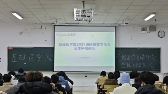 2月26日,基础医学院2024级团总支学生会在南华楼112教室召开了2025年春季学期第一次全体干部例会。此次会议聚焦年级新学期工作规划与发展,2024级辅导员、年级团学会全体成员参与此次会议。