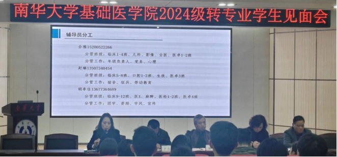 为帮助2024级转专业学生快速适应基础医学院的学习与生活,融入新集体,3月17日晚,基础医学院于医研楼报告厅召开转专业学生老师见面会,基础医学院党委副书记卢清华、副院长谢巍、教学办周春艳、2024级全体辅导员、相关班级班主任以及90名转专业同学共同参加。会议由2024级辅导员胡奉佳主持。