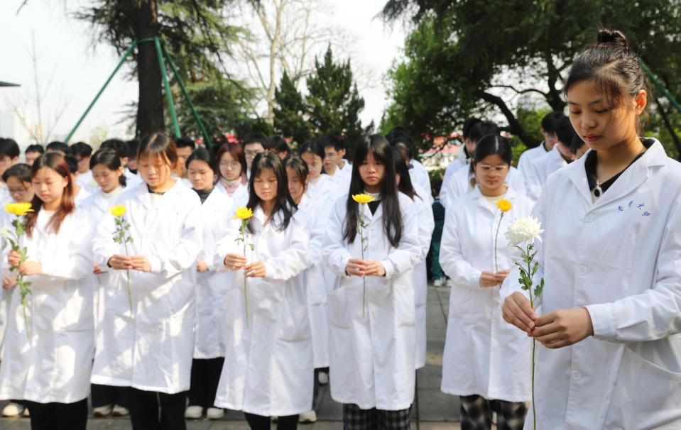 9时整,仪式在庄严的国歌声中拉开序幕,全体师生手捧鲜花肃立,低头默哀,深切缅怀革命先烈。23 级临医02班学生张嘉怡作为代表发言,号召同学们将英烈精神转化为奋斗动力:"将个人理想融入国家发展,以扎实本领守护人民健康。"在仪式的尾声,师生代表们庄重地走向前,向纪念碑敬献菊花。