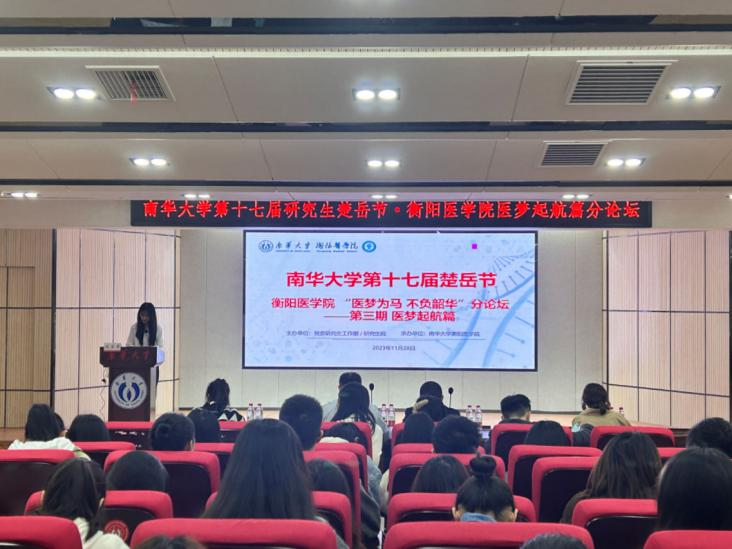 2023年11月28日下午两点,南华大学第十七届楚岳节衡阳医学院“医梦为马 不负韶华”分论坛第三期--“医梦起航”篇在医研楼一楼学术报告厅顺利举行。本次论坛邀请了南华大学拔尖人才、基础医学院副院长张晓东教授,南华大学高层次人才瞿小旺教授做学术报告;2023级临床医学专业博士研究生郑星雨,2021级基础医学专业硕士研究生彭莉轩作学术分享。论坛由学院研究生团学会学生干部王婕主持。