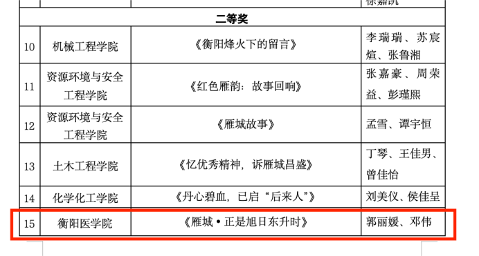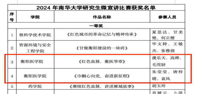 为庆祝新中国成立75周年,培养我校研究生的爱国主义精神、革命精神和责任意识,由南华大学党委研究生工作部主办,“薪火”师生宣讲团承办的“赓续红色血脉,讲述雁城故事”研究生微宣讲比赛日前成功举办。本次比赛是以“挖掘一批故事、创作一批精品、培养一支队伍”为目标要求。在学院选手的拼搏努力下,学院共获得2个一等奖和1个二等奖。其中,作品《红色血脉,衡医华章》和《巾帼心向党,奋进新征程》荣获一等奖,作品《雁城•正是旭日东升时》荣获二等奖。