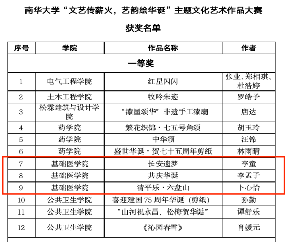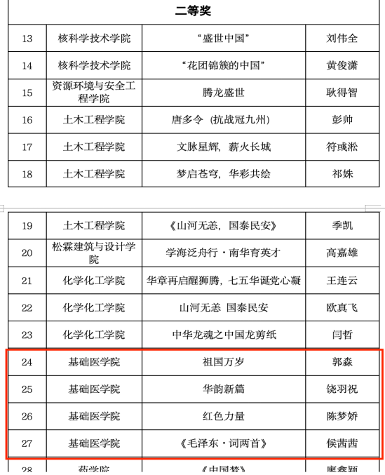 经评审,本次大赛衡阳医学院选送的9个作品获奖,其中《长安遗梦》、《共庆华诞》和《清平乐·六盘山》荣获一等奖,《祖国万岁》、《华韵新篇》、《红色力量》和《毛泽东·词两首》荣获二等奖,《春风得意马蹄疾,一日看尽长安花》荣获三等奖。中