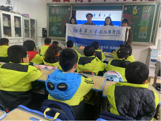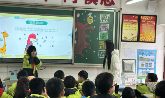 为推进"健康中国"建设,加强“一院一品”活动,2025年2月21日,南华大学衡阳医学院研究生团学会"青春向党 医路阳光"健康科普社会实践团深入蒸湘区实验小学,在三年级9班开展"预防肺结核"主题健康科普实践活动。通过寓教于乐的形式,在小学生群体中开展肺结核知识科普,助力提升小学生传染病防控意识。